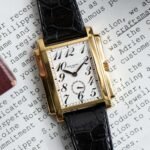 - A highly-legible white dial with black period Arabic numerals and a small seconds counter at six o’clock continue the watch’s Art Deco theme
