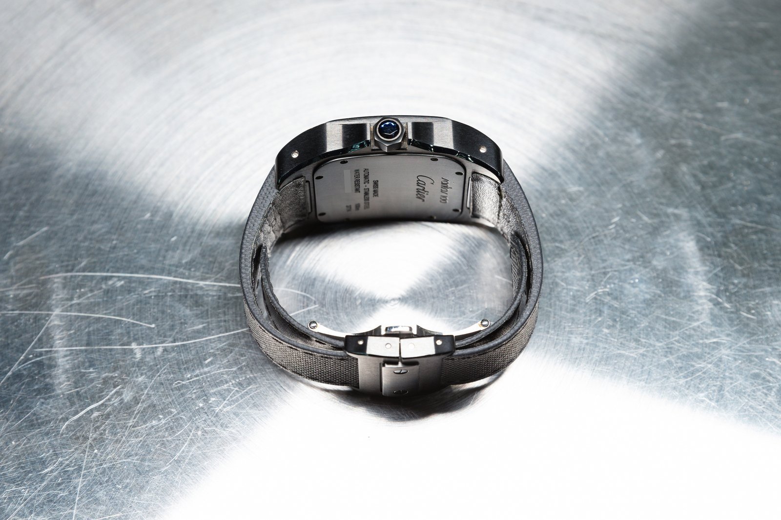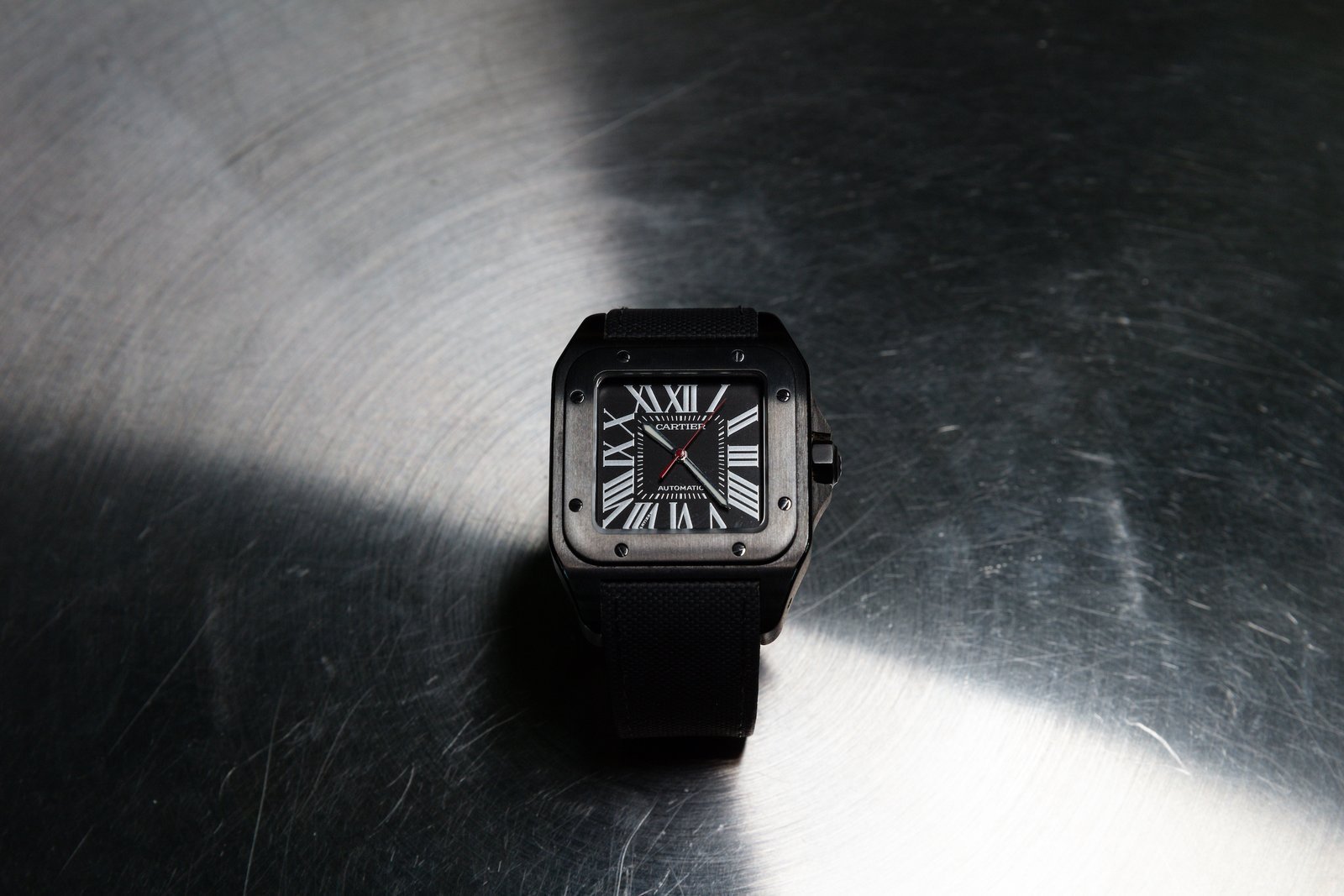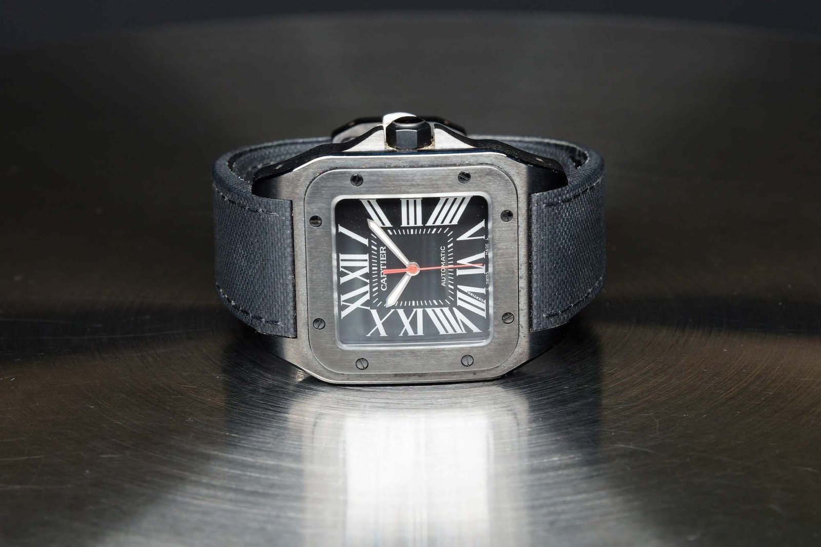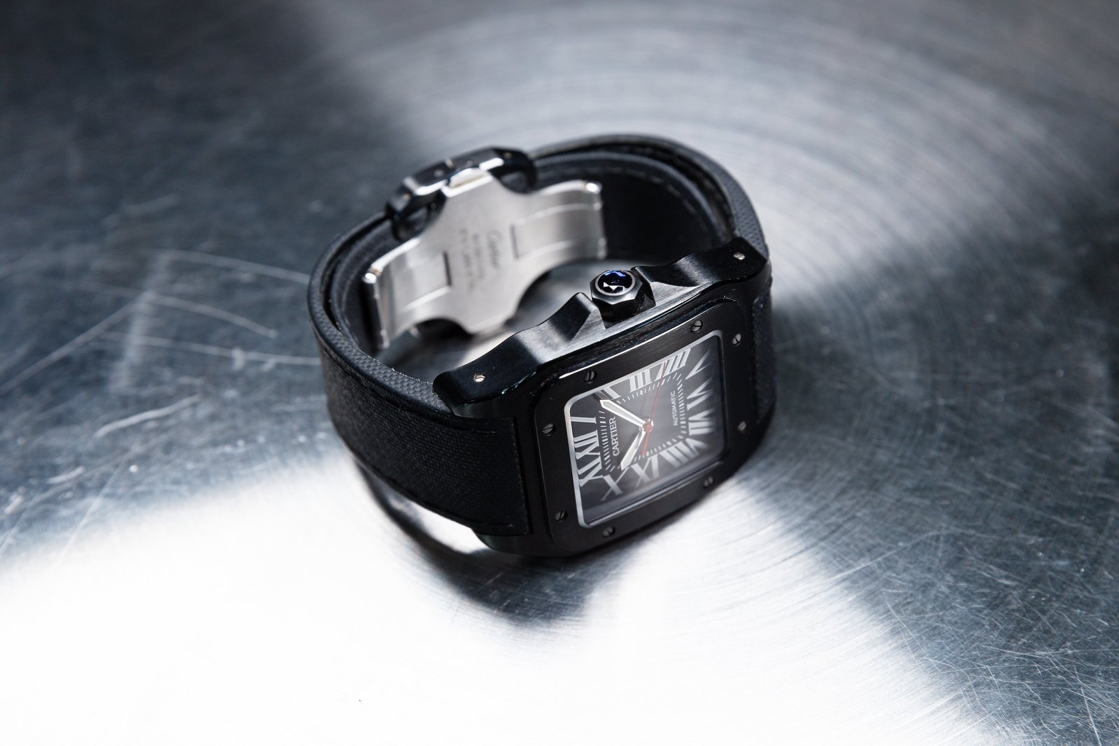 • ​The black dial retains Cartier’s signature Roman numerals and central minutes track, but a red seconds hand adds a touch or sportiness
