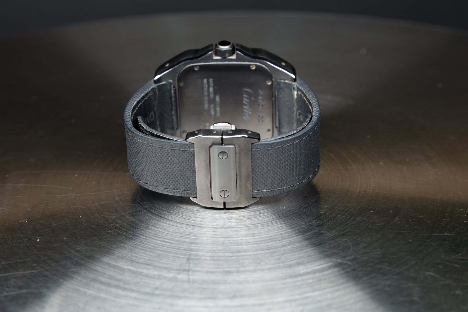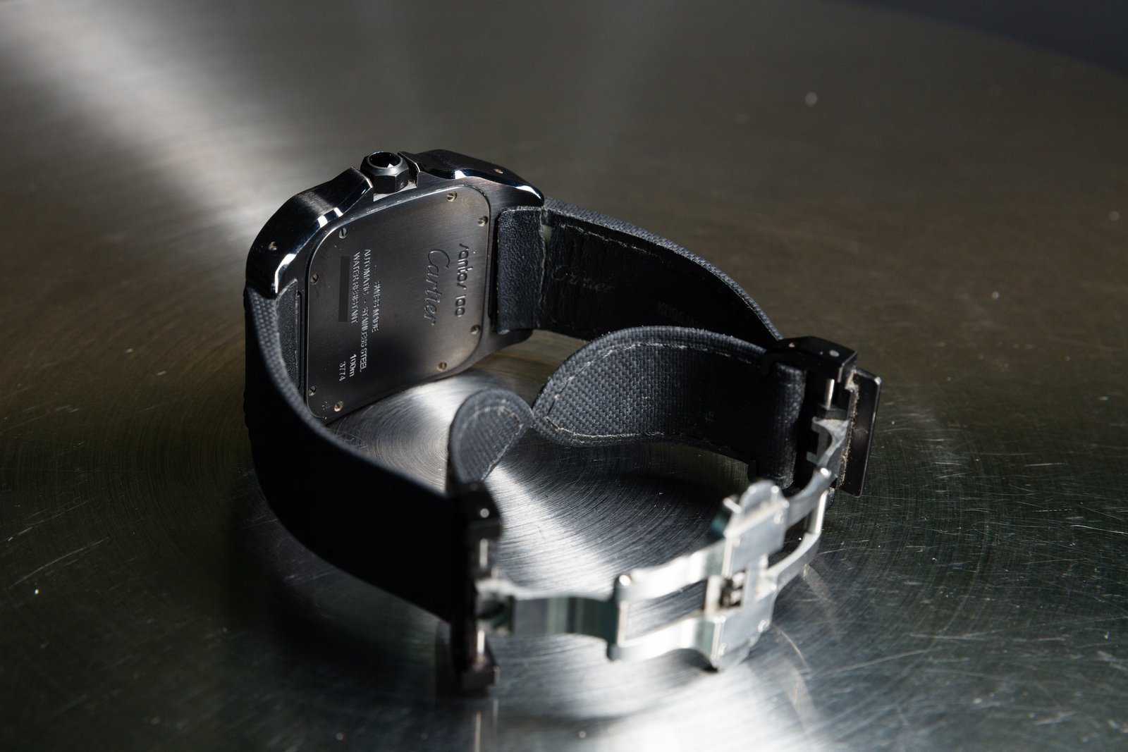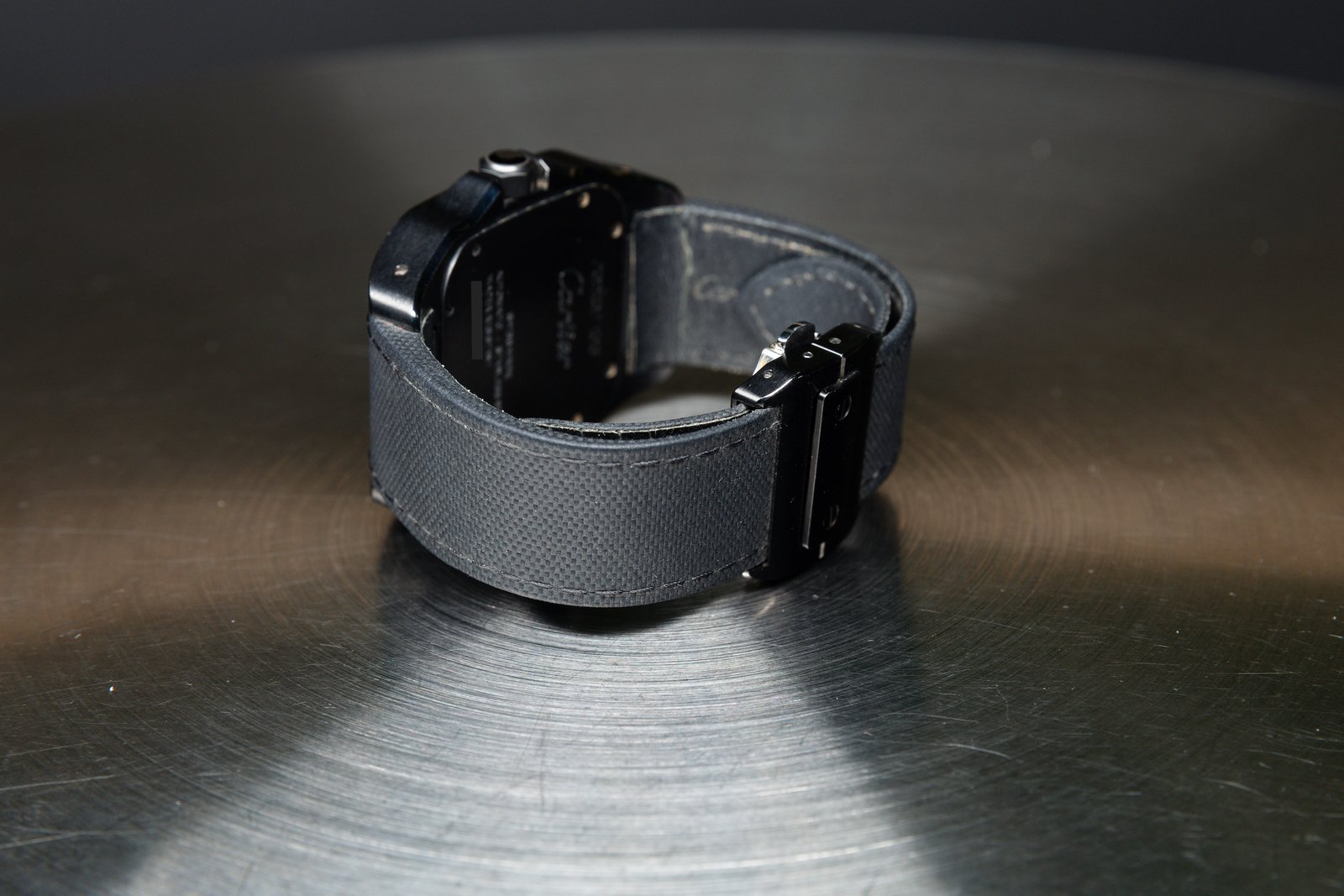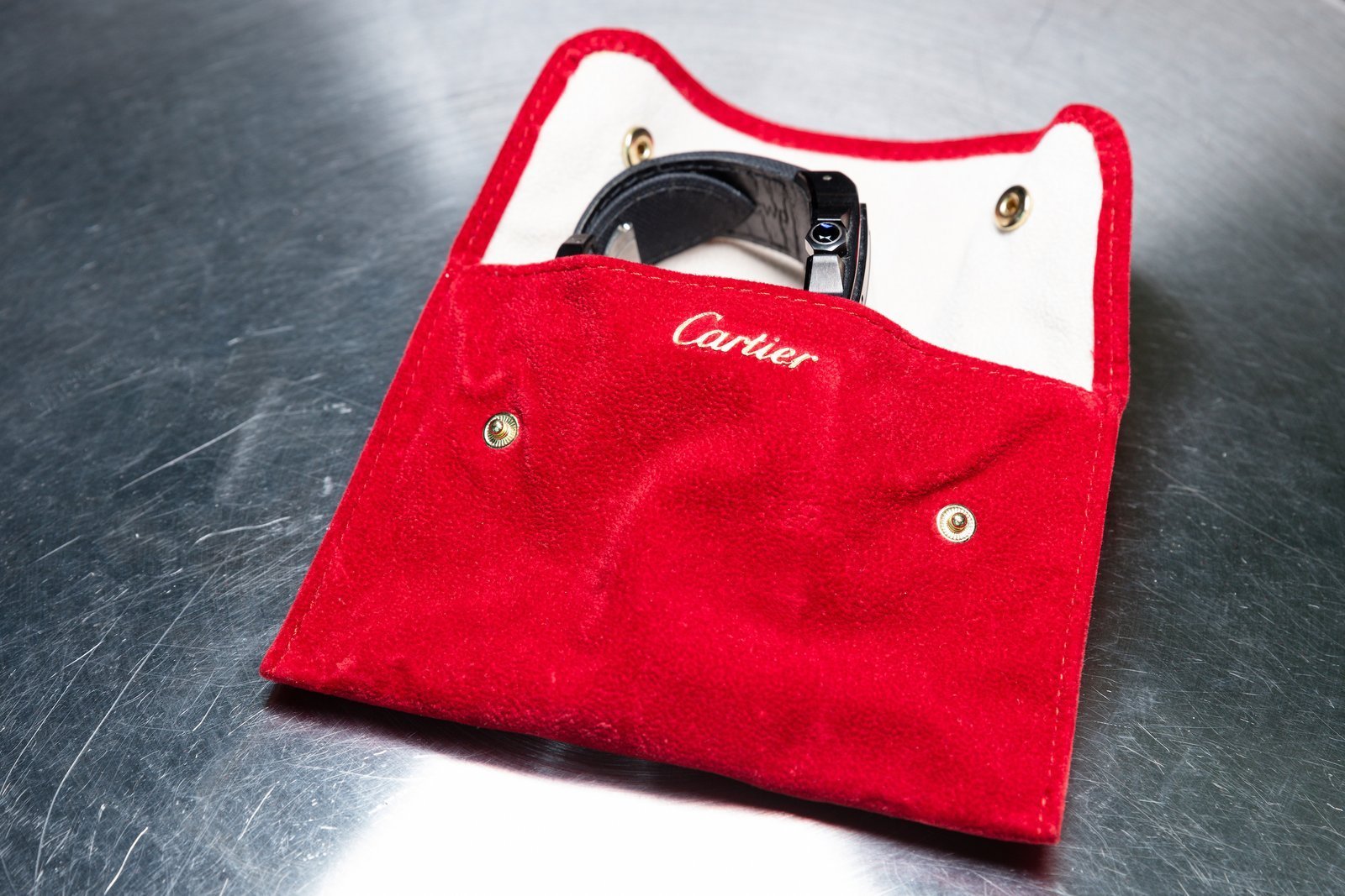 • ​The black dial retains Cartier’s signature Roman numerals and central minutes track, but a red seconds hand adds a touch or sportiness