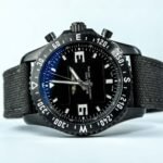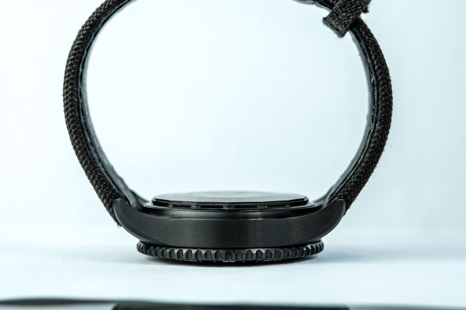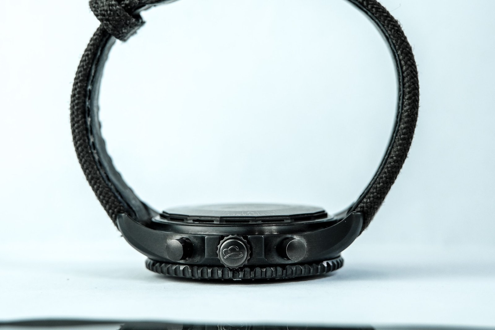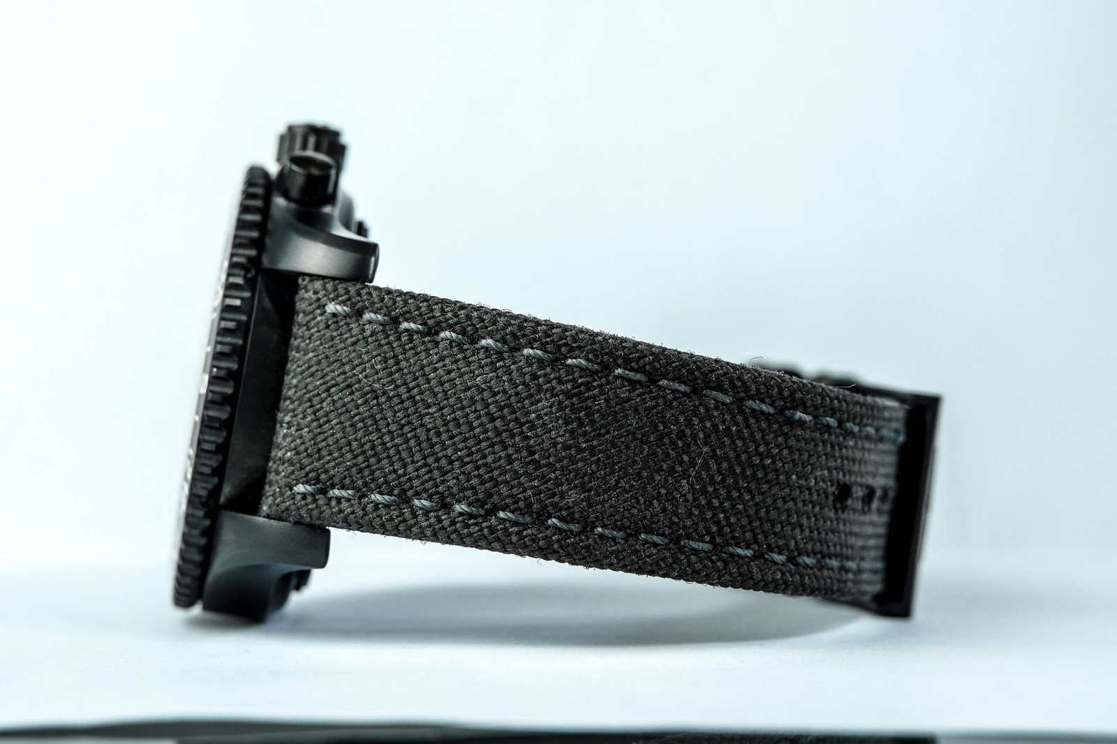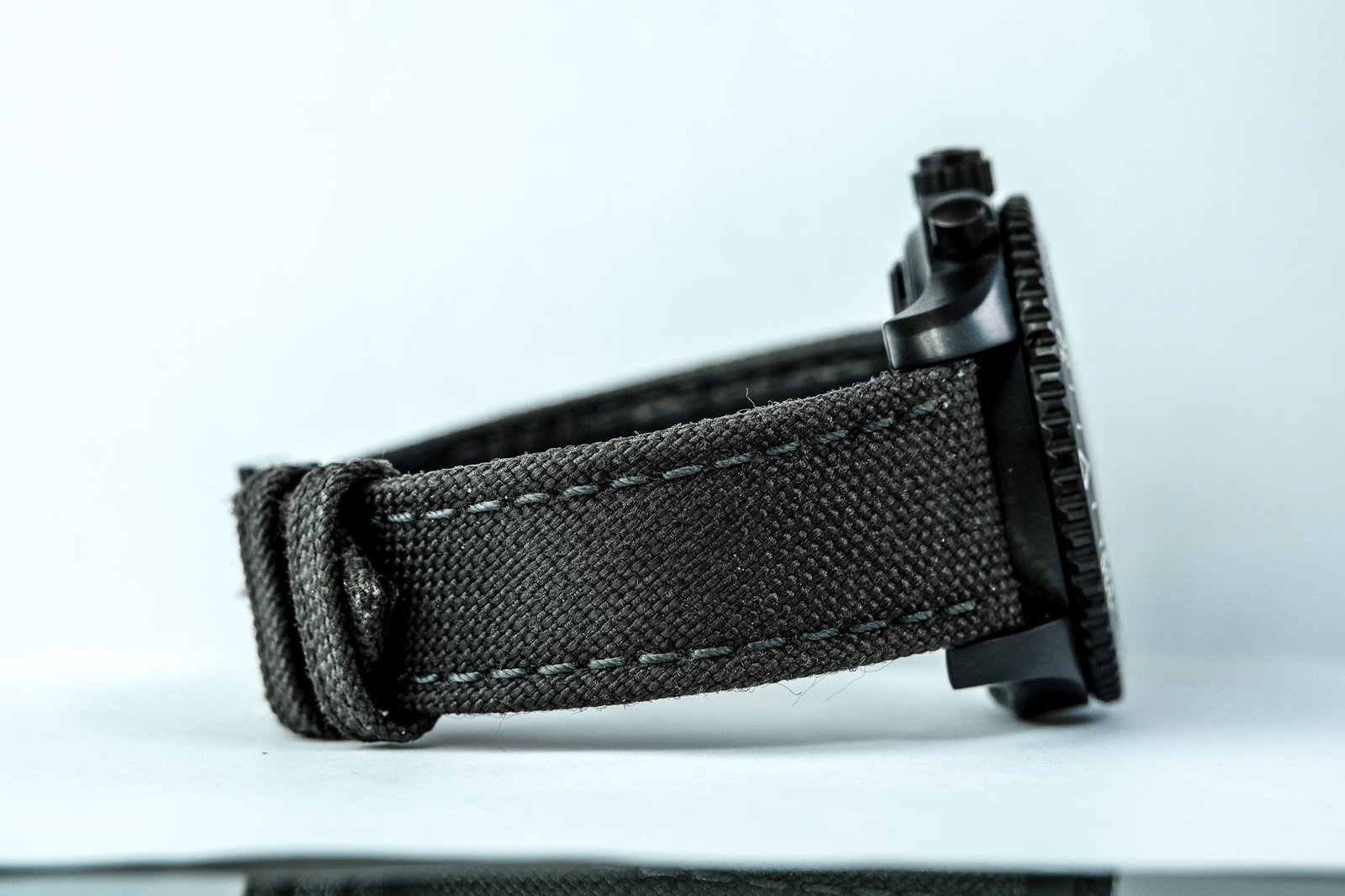- Its rugged construction features a black PVD-coated steel case coupled to a fabric strap