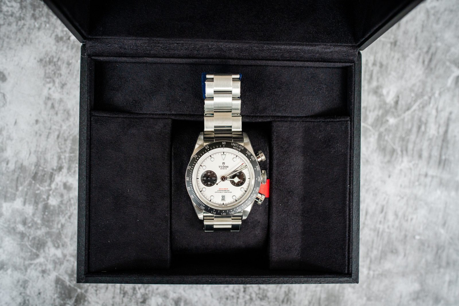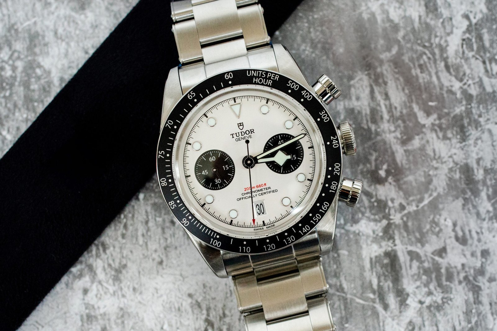 - Re-launched in 2021, the Black Bay Chrono is available in two dial configurations including this white ‘panda’ version with black chronograph sub-registers and a black tachymeter embellished bezel