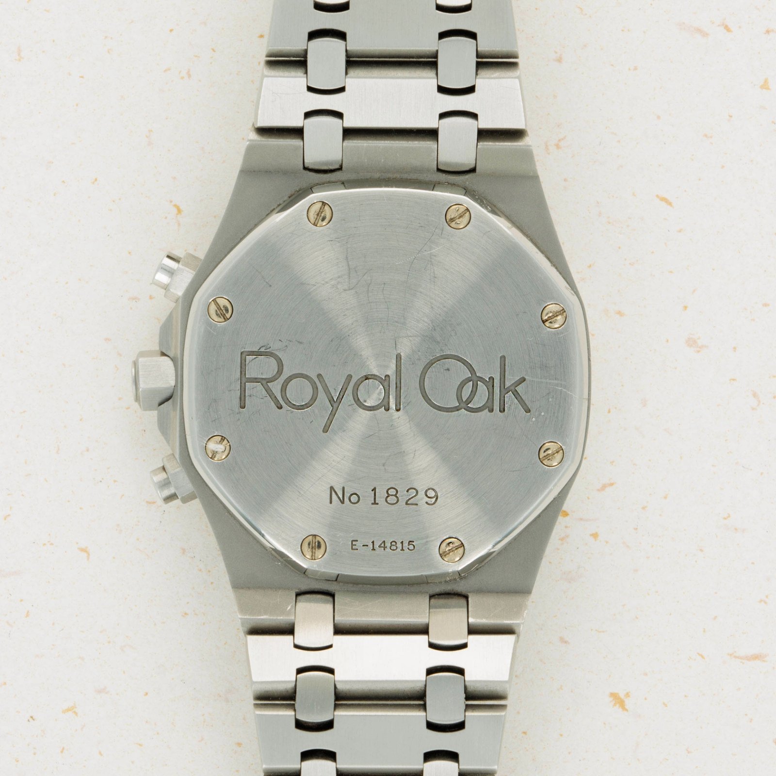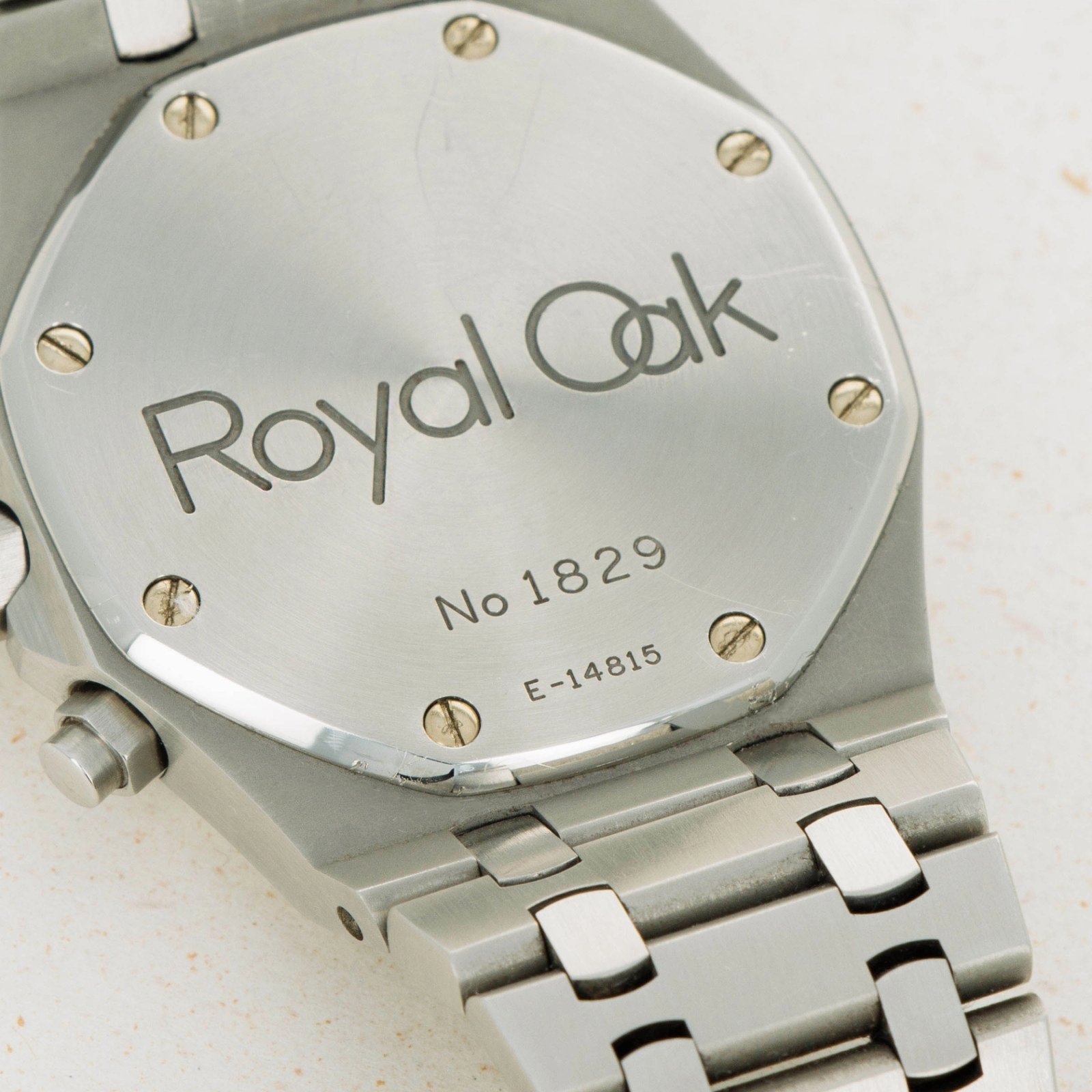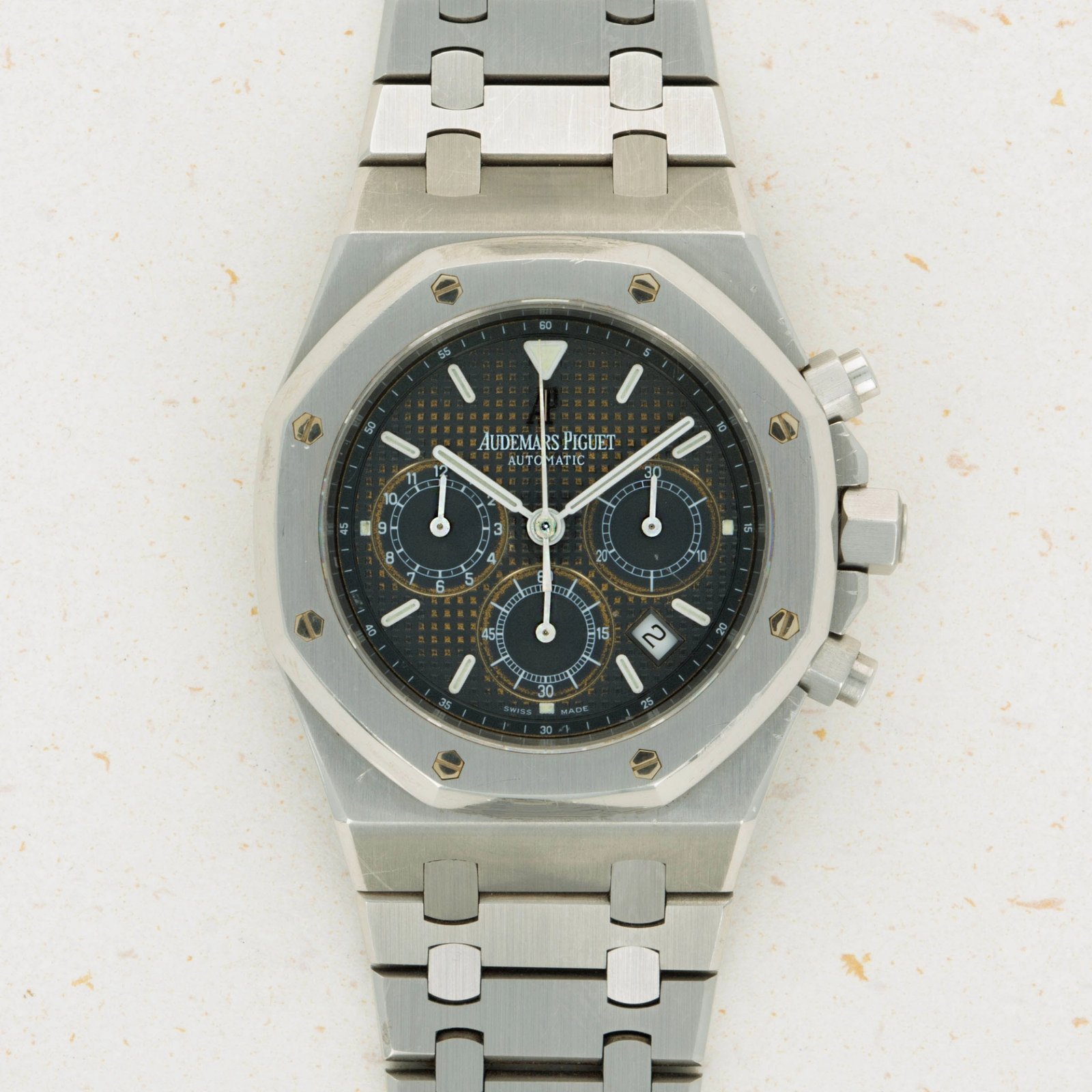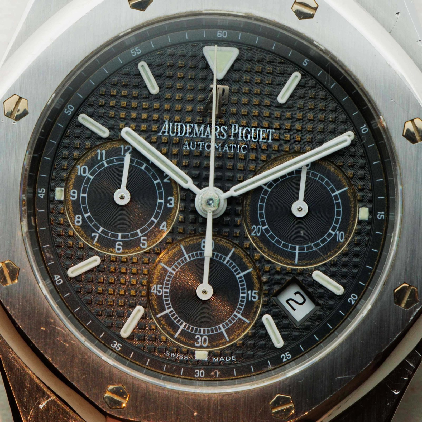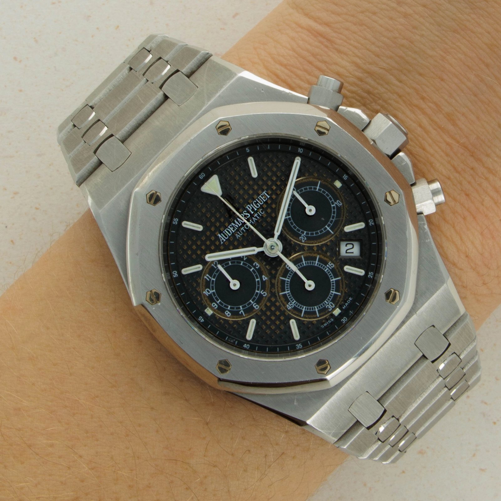 A classic example of the Audemars Piguet tapisserie dial, showcased here in black but with a golden shimmer at its center thanks to its attractively tropicalized core.