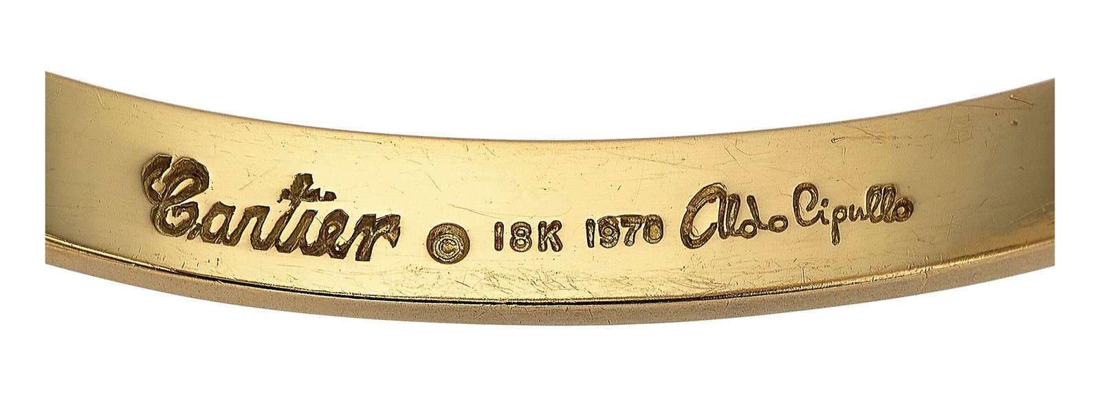 Condition Notes: Scratches to the surface of the gold commensurate with normal wear. Accompanied by a signed box that shows slight damage on the exterior. The bracelet is a Cartier size 15. Marked 18k.