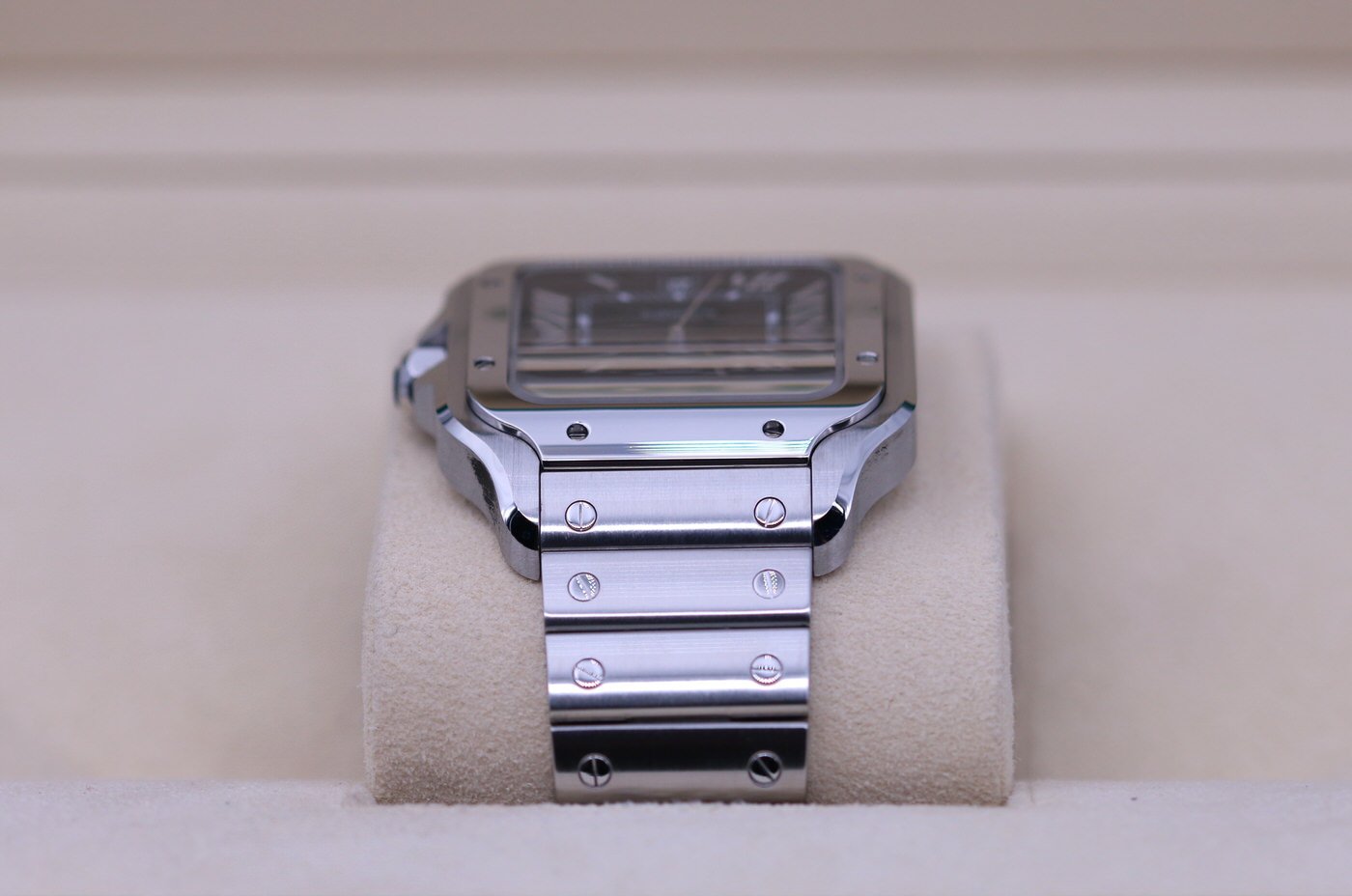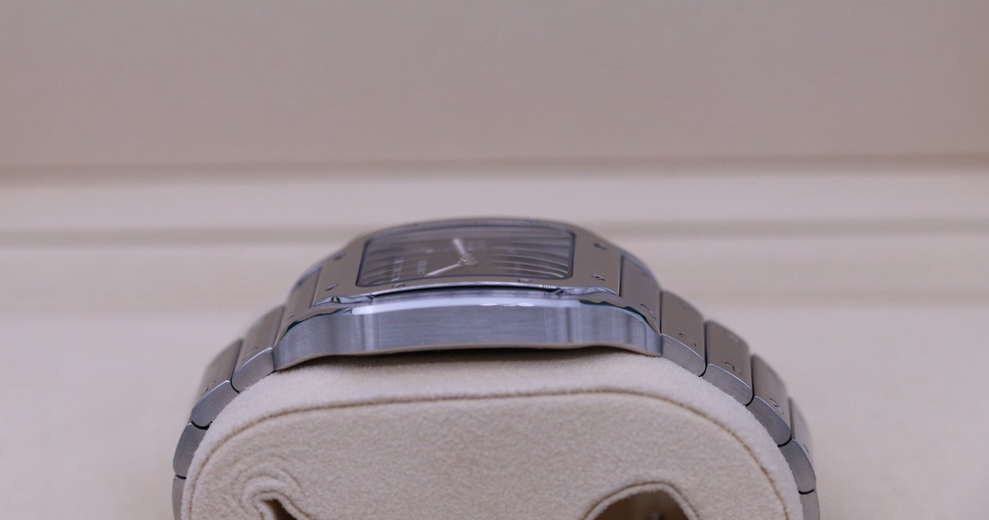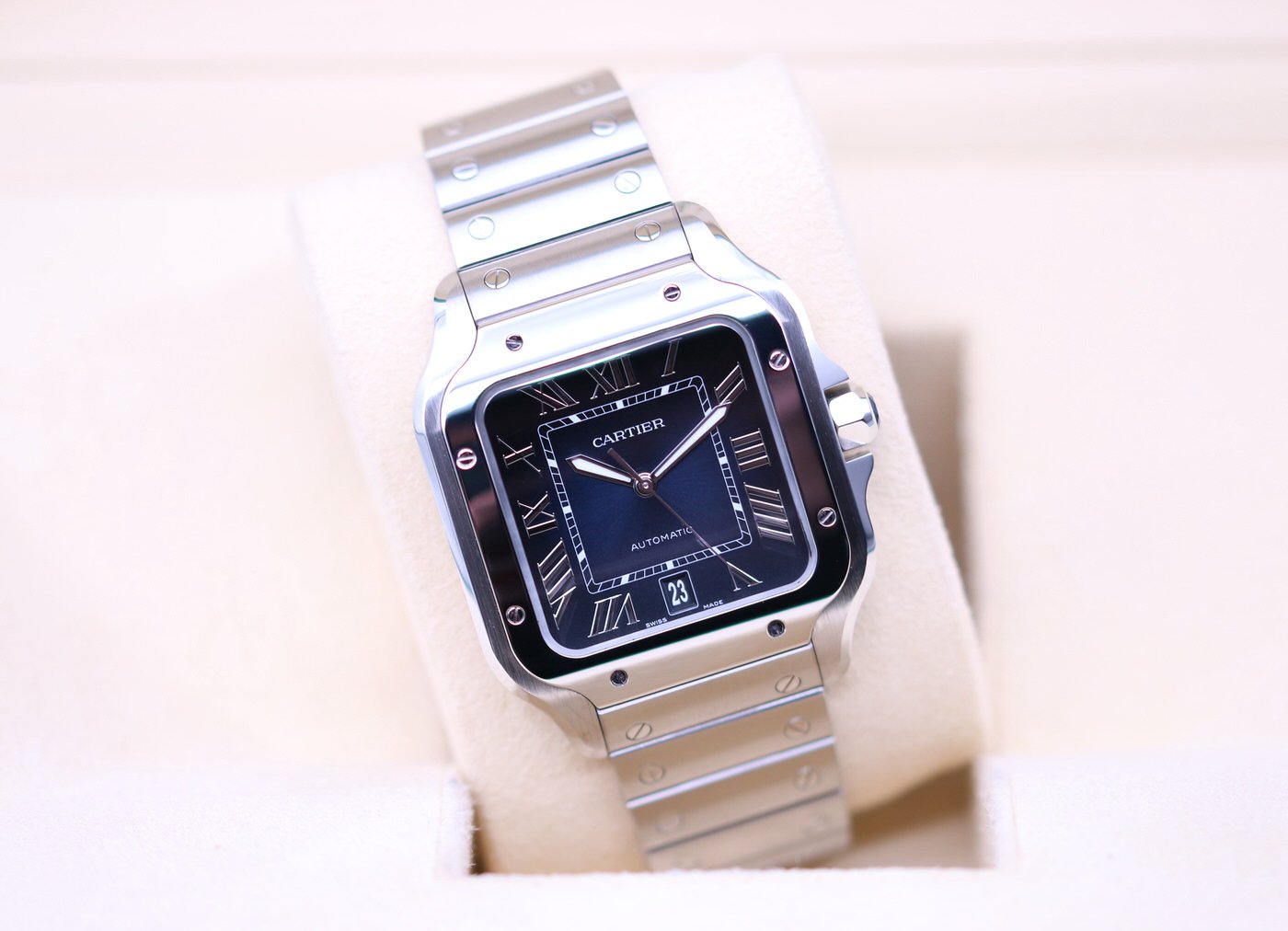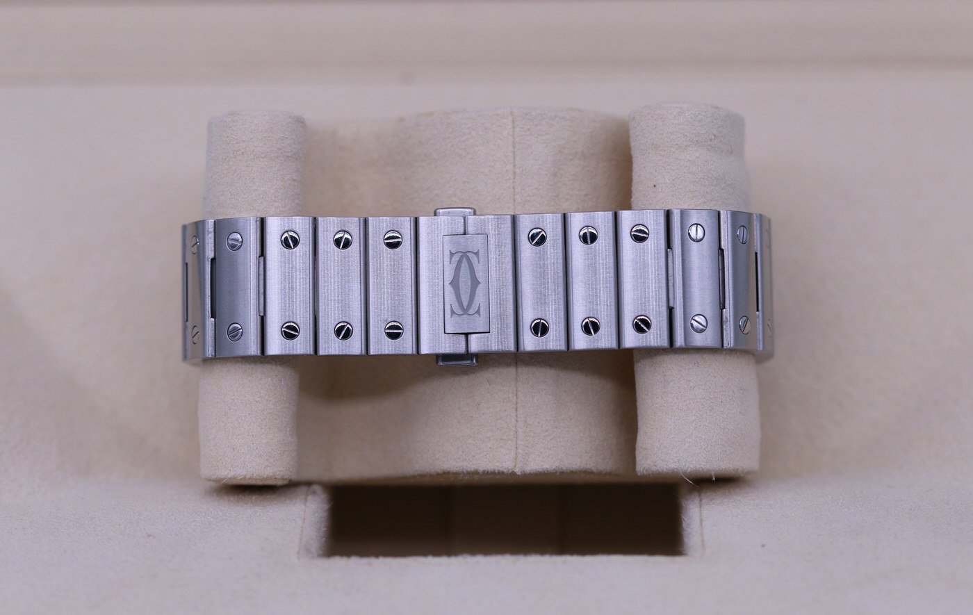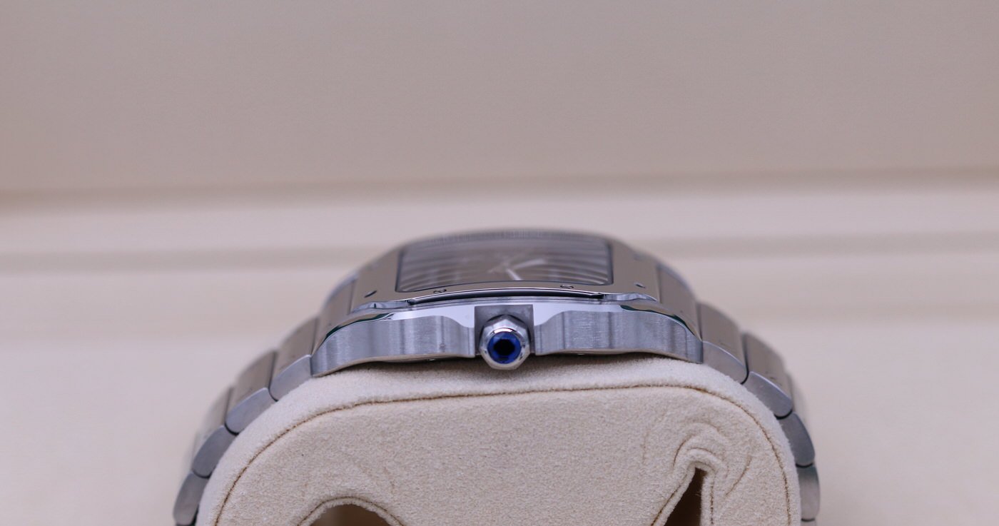 This Cartier Santos is in brand new condition. It is the mens watch in large size and comes with the other strap and clasp. It is the very desirable blue dial. It is complete with box and papers and was originally sold in February of 2022.