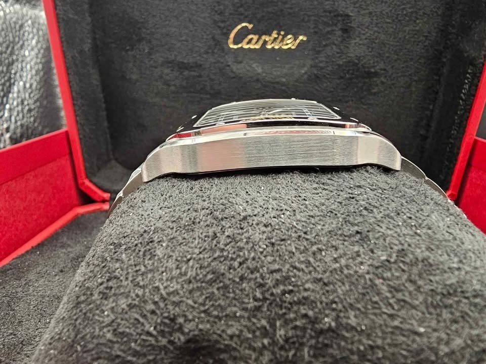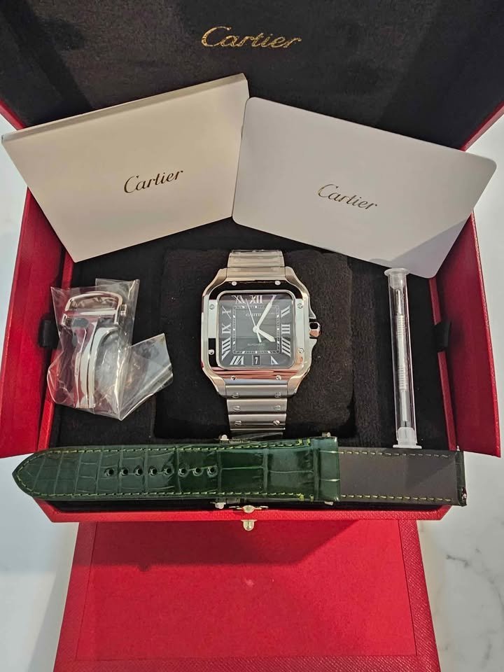 This Cartier Santos is Unworn with Stickers, It is the large size featuring the sought after green dial. Comes as a complete set with the watch, box, warranty card, other strap and clasp, service tool, Cartier booklets, and bezel protector.