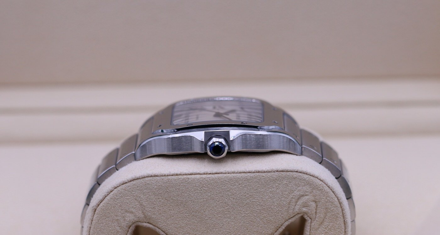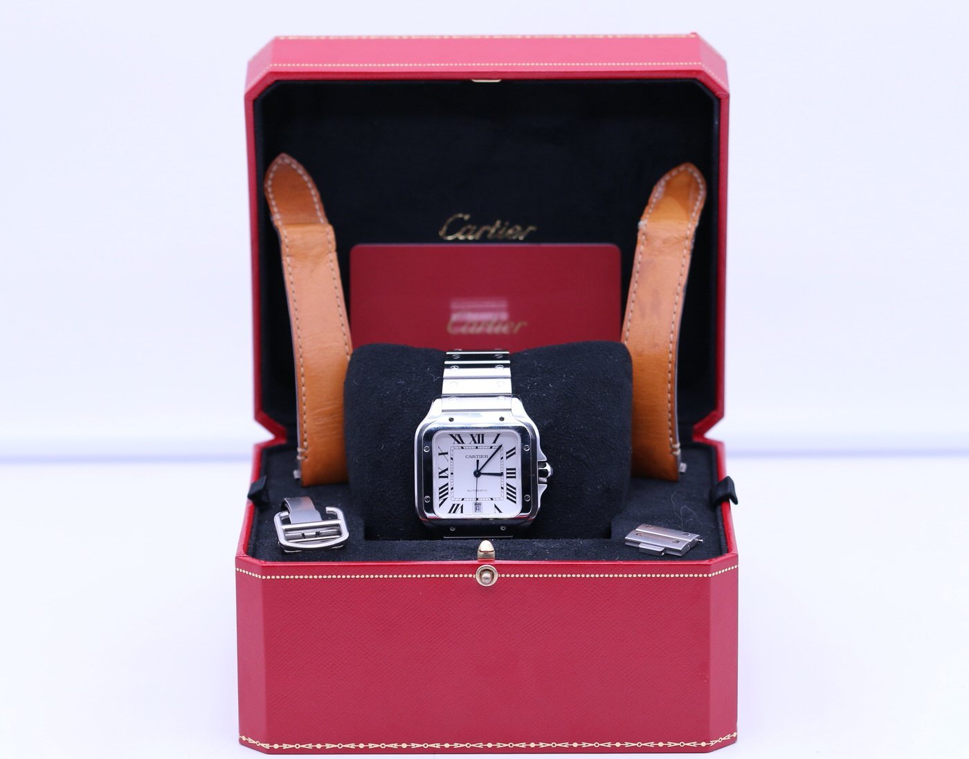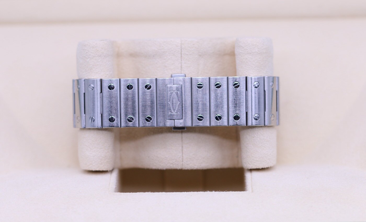 This Cartier Santos is in very good condition. It is the large size and comes with the inner box (missing red outer box), booklet, strap & clasp, and warranty card. The warranty card is dated June of 2019.