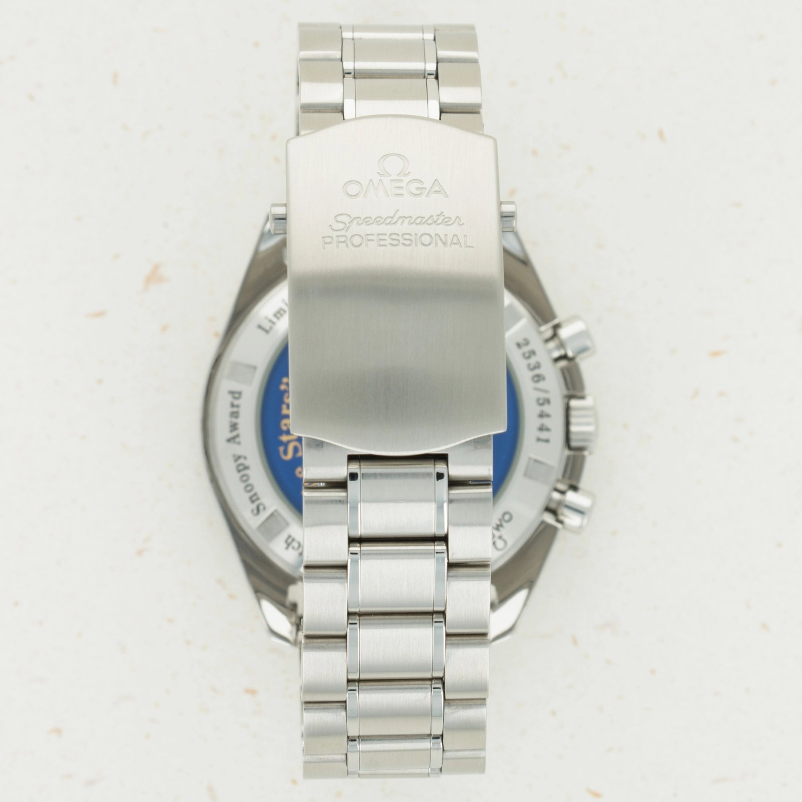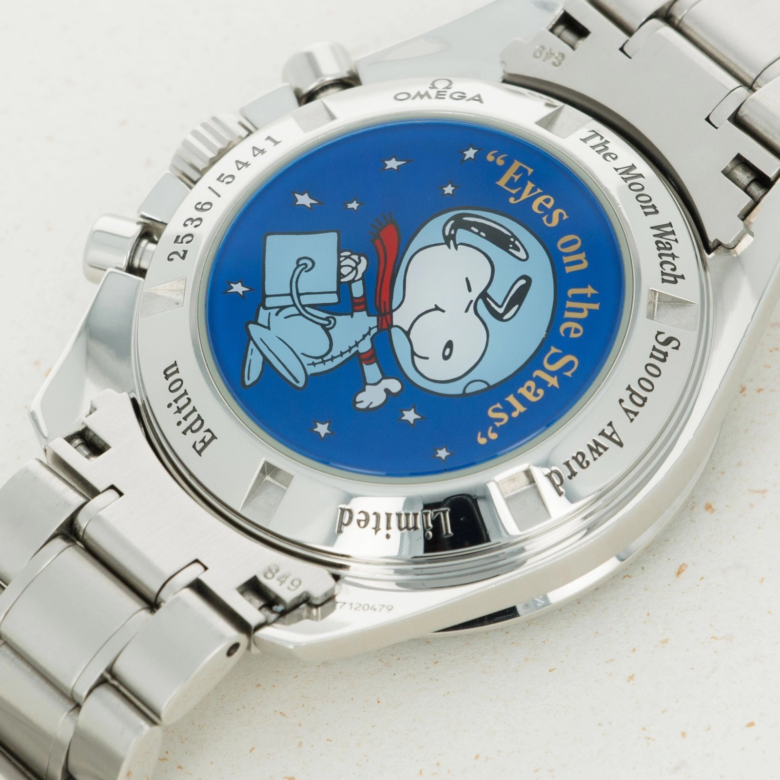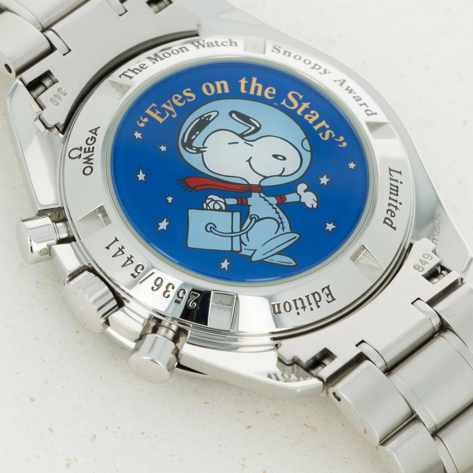 Caseback Engraved with “Ω OMEGA – The Moon Watch – Snoopy Award – Limited Edition – xxxx/5441” and “Eyes on the Stars” patch