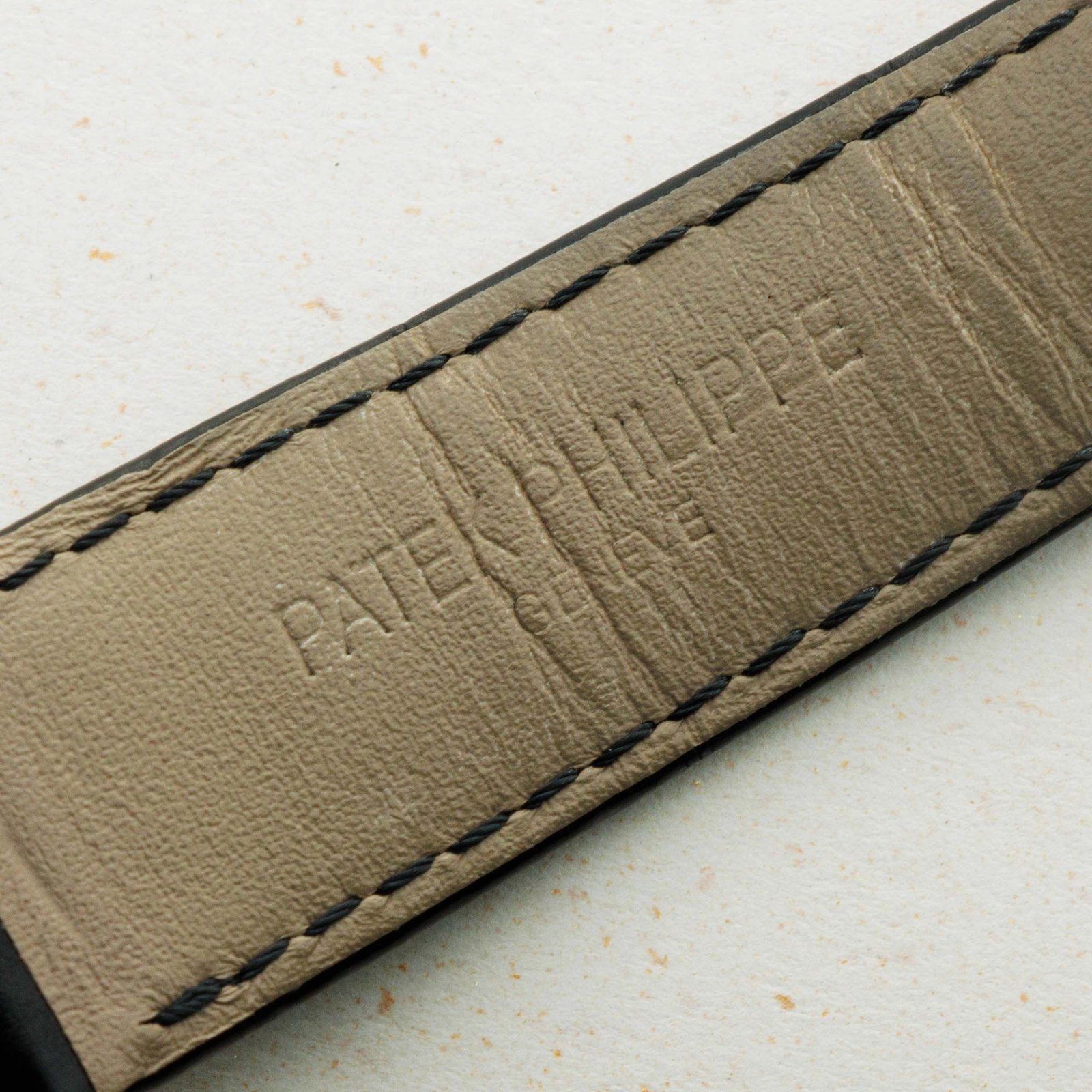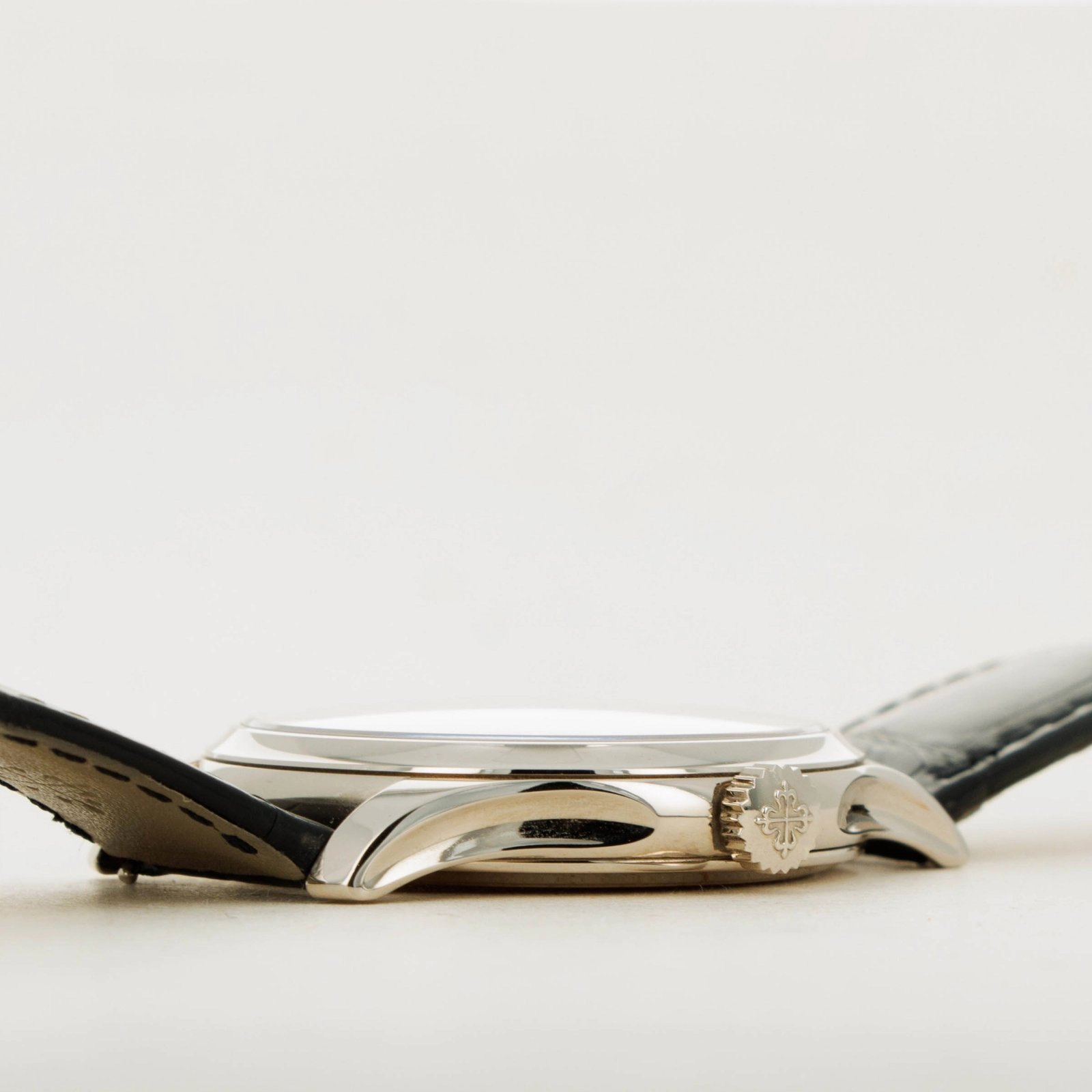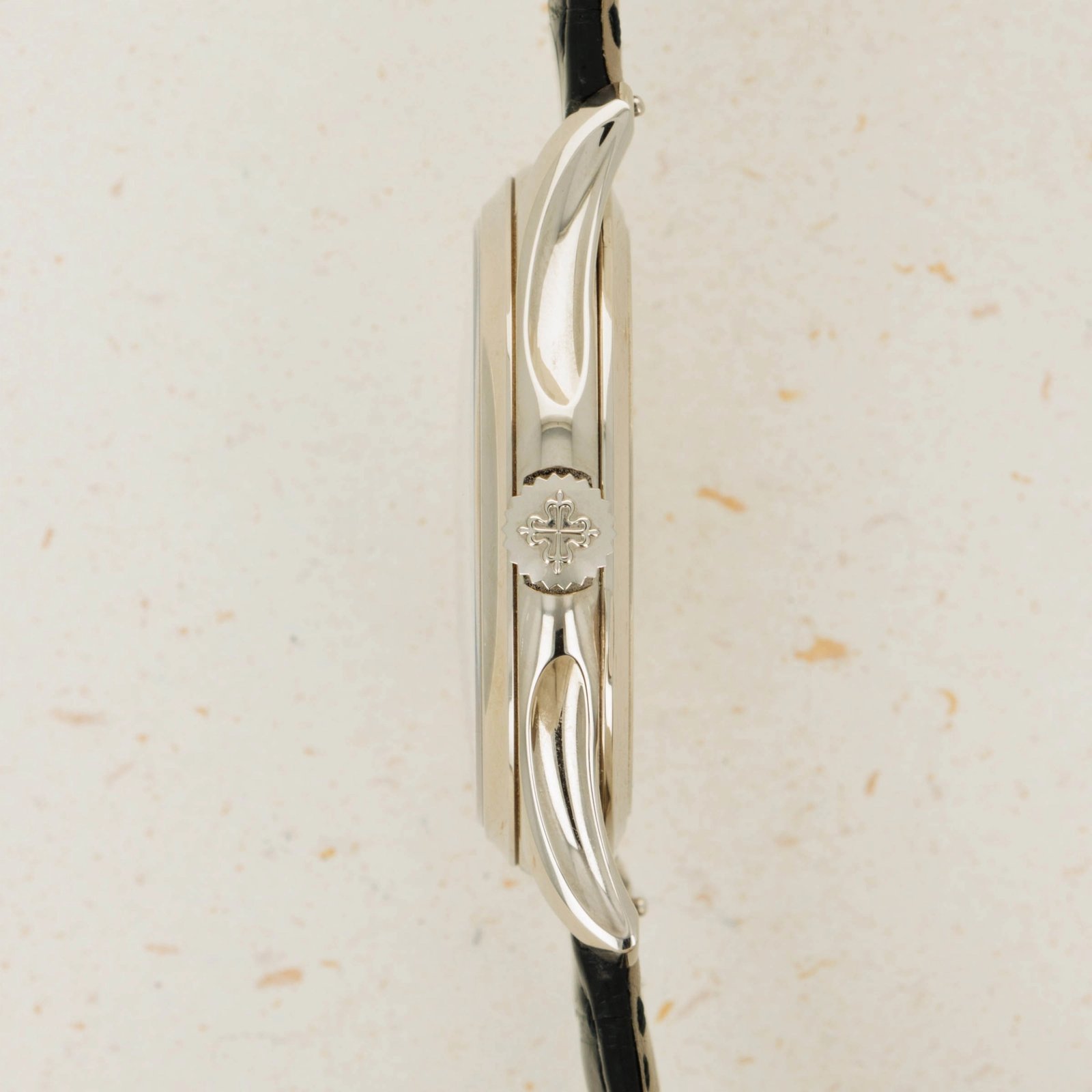 Boasting a black lacquered dial, the ref. 5227G’s display is perfectly suited to the understated nature of its design and construction, with 18kt white gold dauphine hands and applied indices.