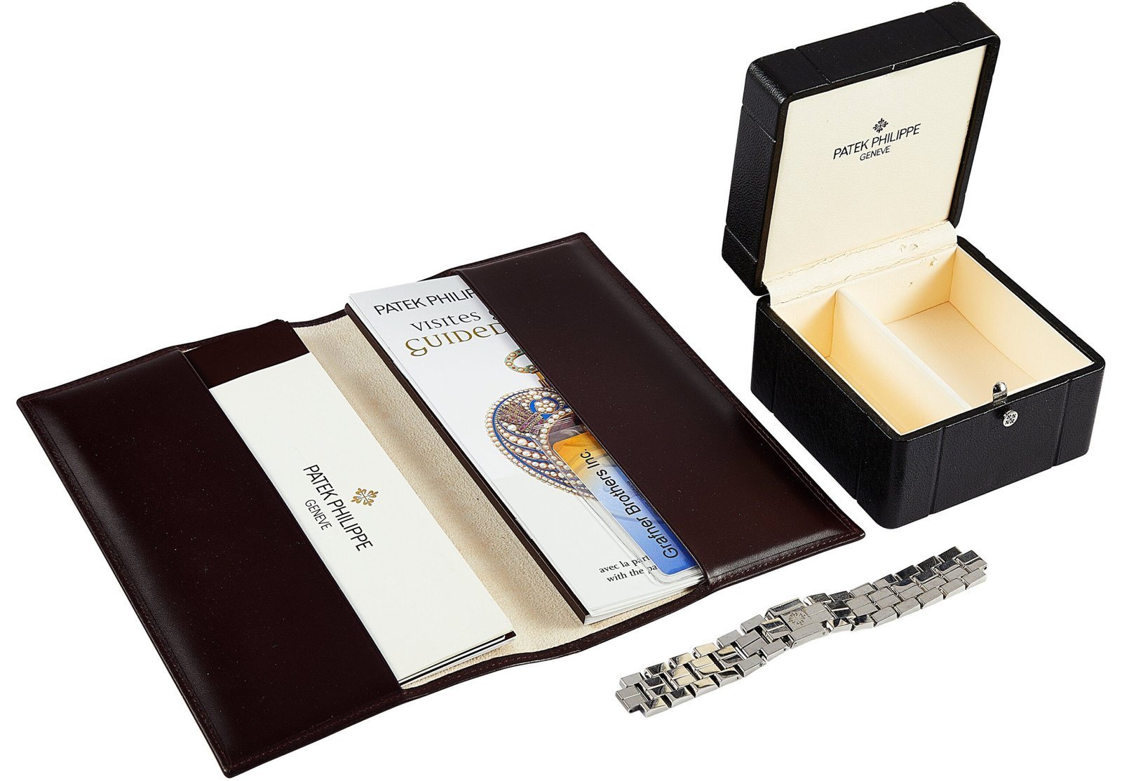 This timepiece is accompanied by the Certificate of Origin listing date of sale as 12-14-03, inner and outer boxes (not interior pillow), all booklets and bi-fold, hang tag and additional Patek Philippe steel bracelet for the model (no end links included)