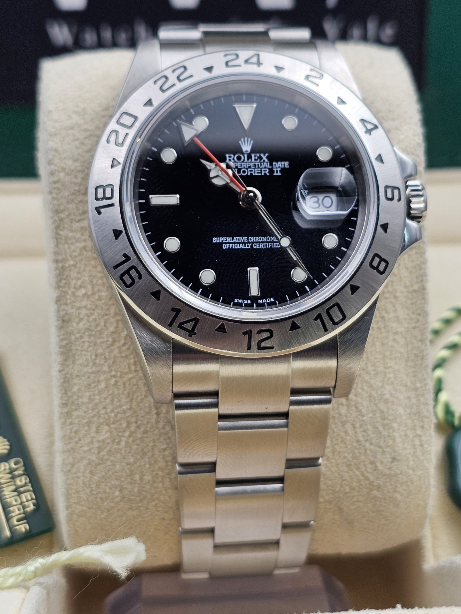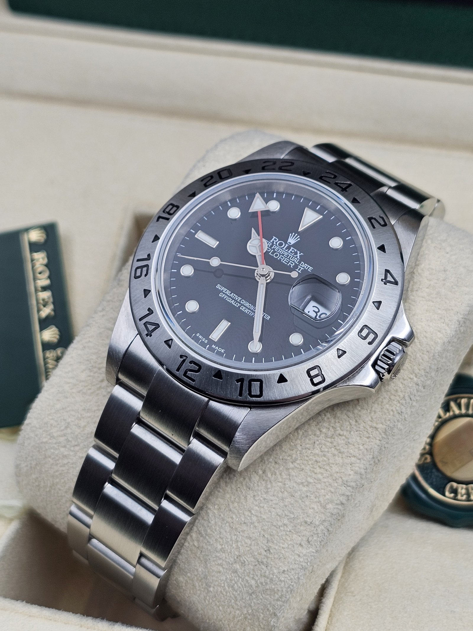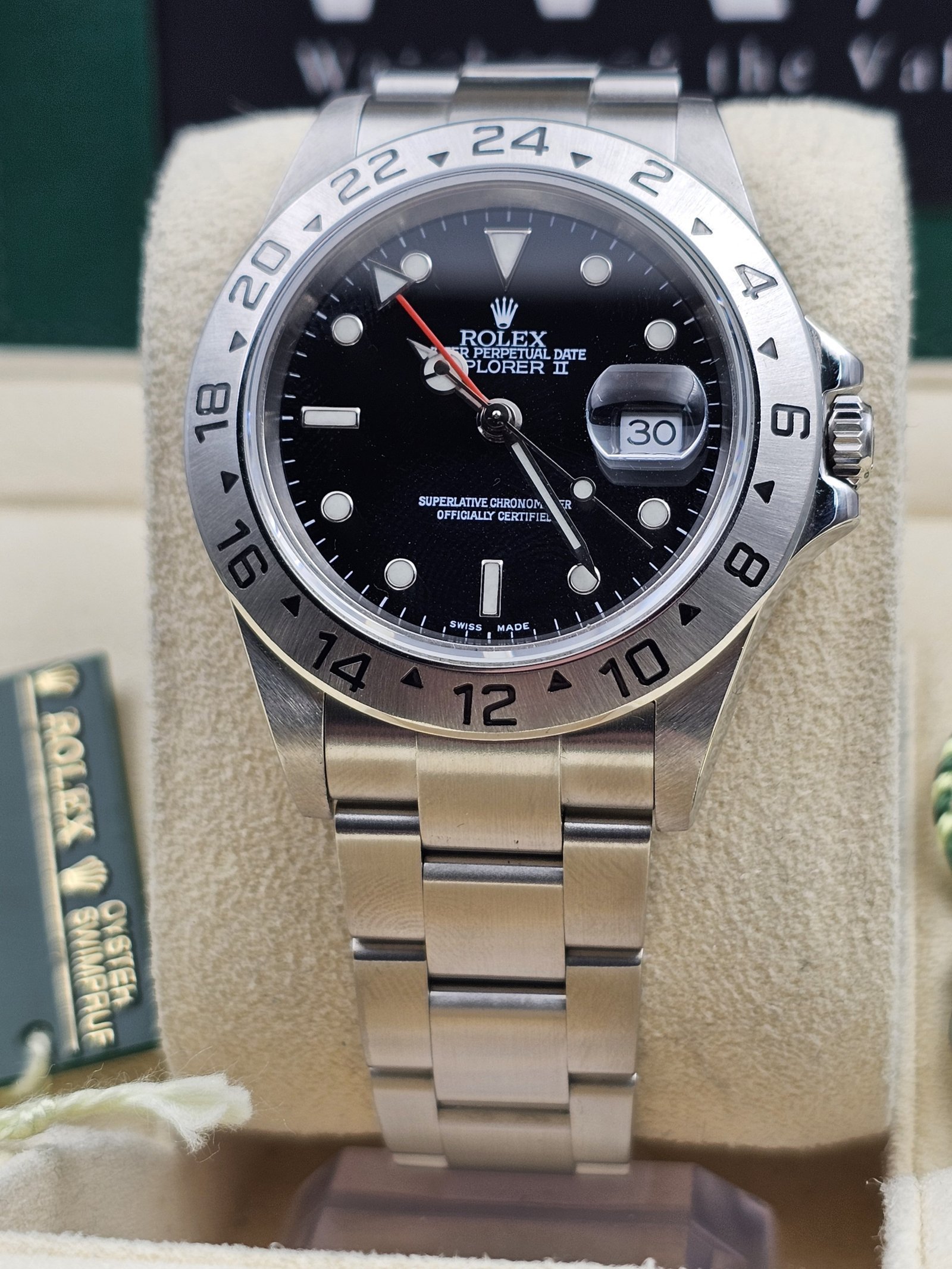 The Rolex Explorer II 2005 (Reference 16750) is a timeless classic embodying rugged elegance. With a 40mm case size, this automatic timepiece boasts impeccable condition, accompanied by its original box and papers. A symbol of adventure and precision, it’s ready to accompany its wearer on any journey.