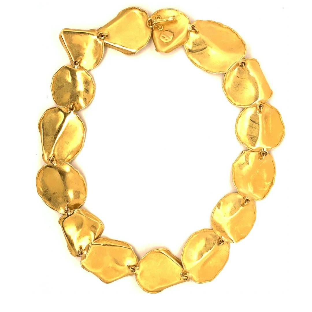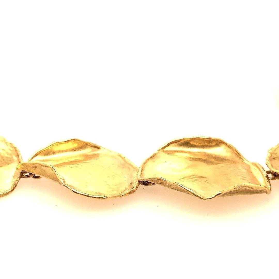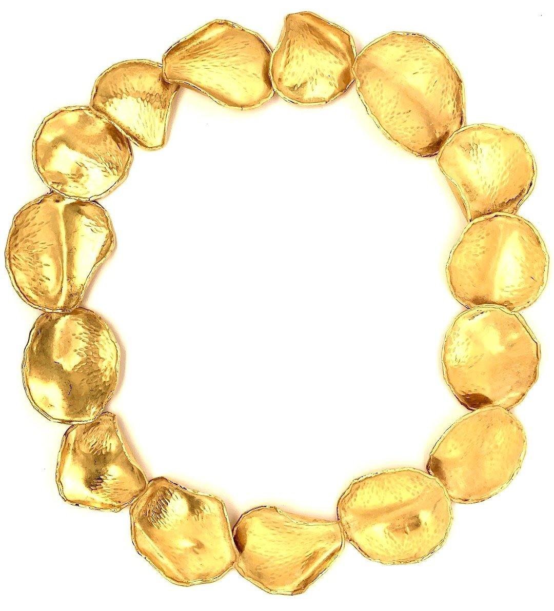 A Tiffany & Co. suite designed by Angela Cummings that includes a necklace and a pair of earrings. The necklace is composed of a series of hand-hammered textured gold links rose petals, slightly different in design, individually cast by Angela Cummings, with a pair of clip-on earrings en suite, all mounted in 18K yellow gold.