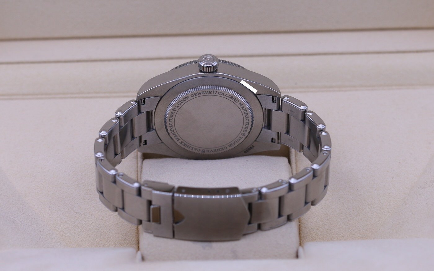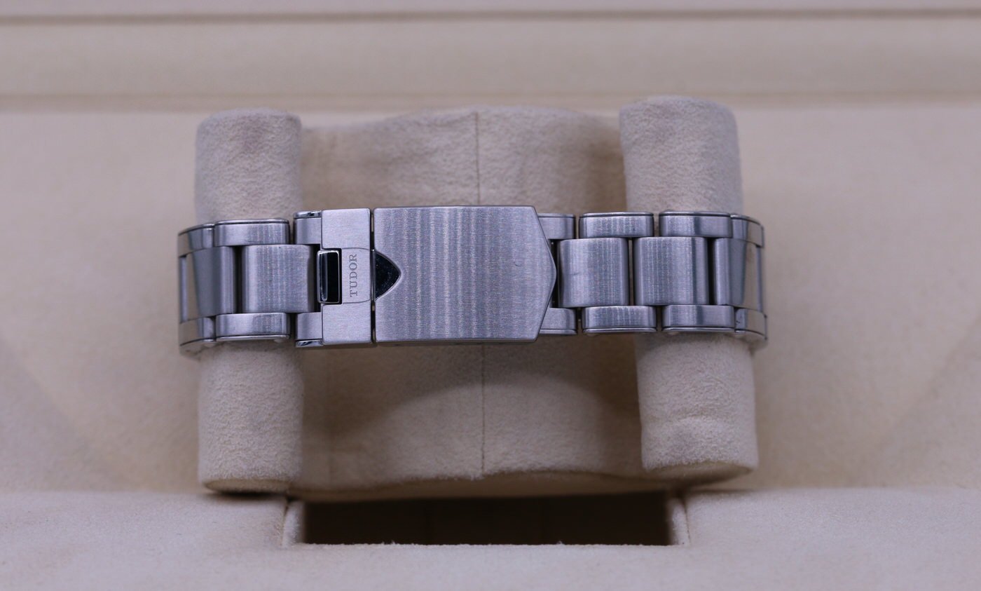 The bracelet is in excellent condition with some light hairlines and swirls. It has all the links and will fit around a 7.75″ wrist.