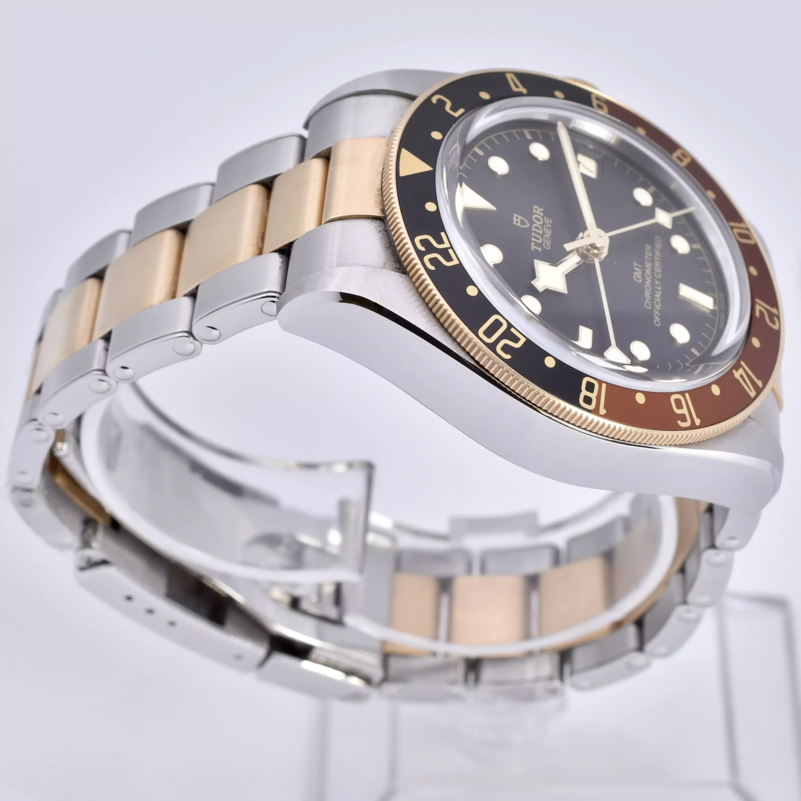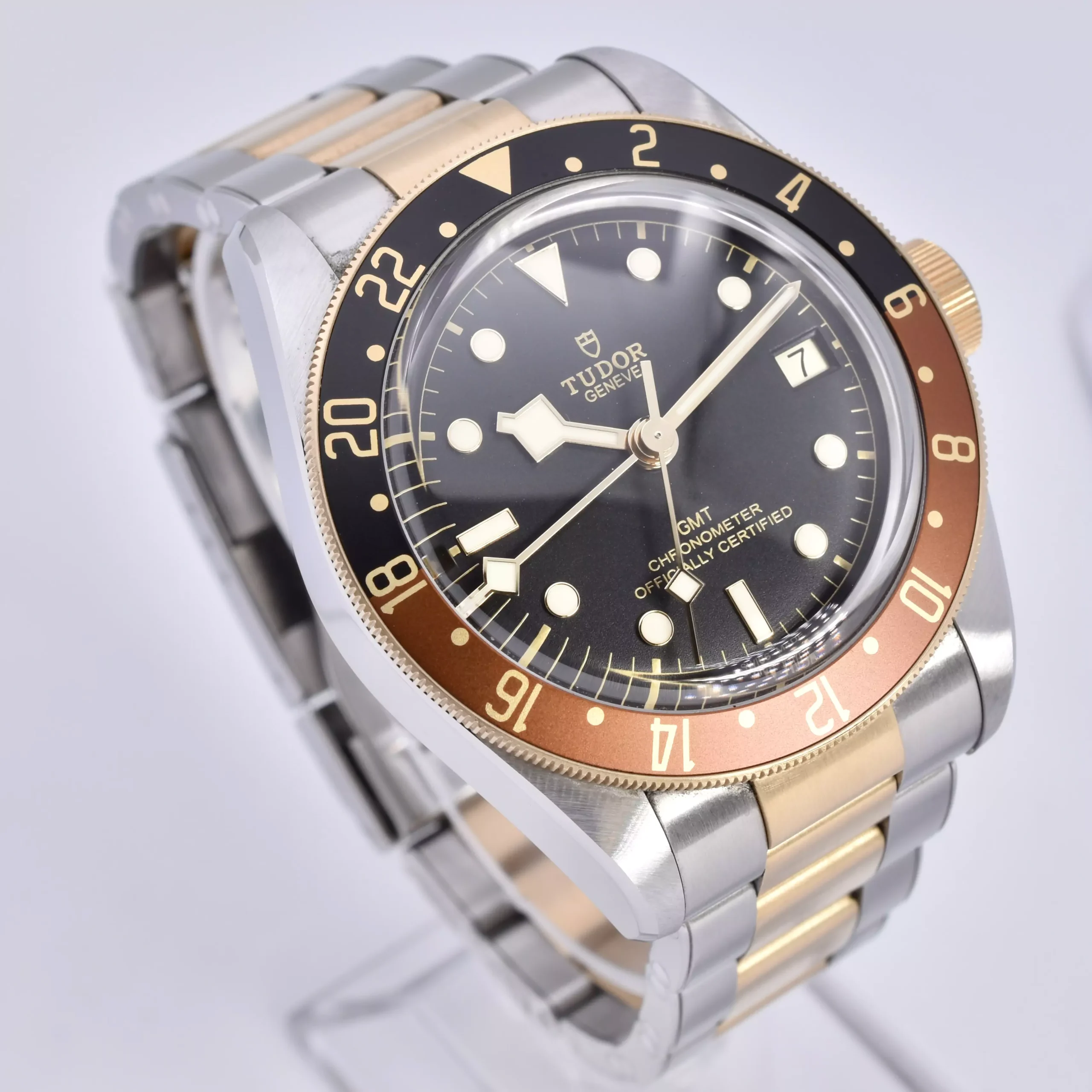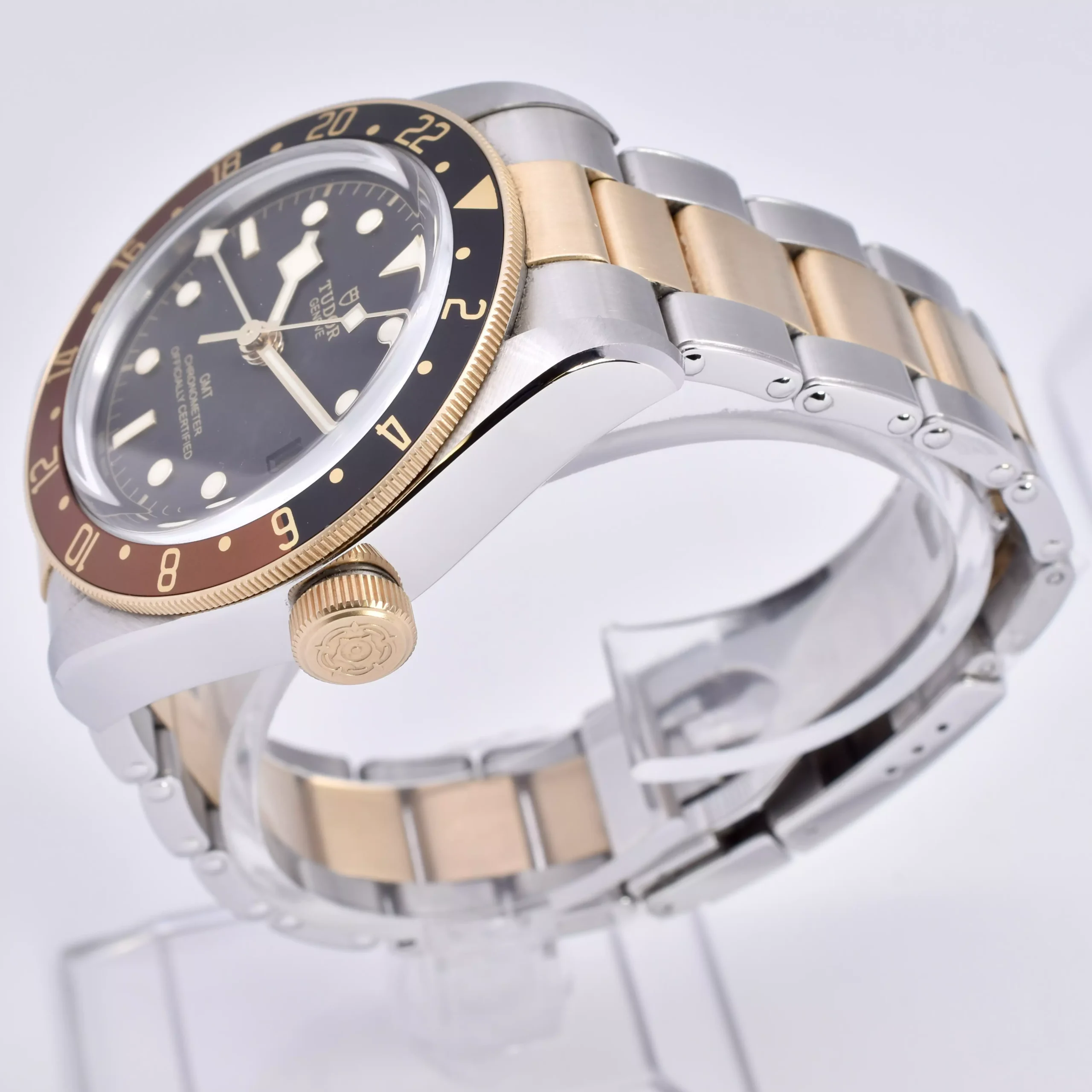For Sale is an excellent example of the Tudor Black Bay GMT 79833MN. this model has a 41mm case diameter with a steel & gold bracelet.