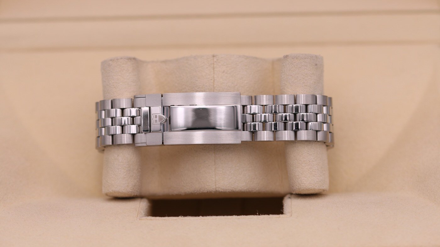 The bracelet is in very good condition with some small hairlines and marks. It has all the links and will fit around a 7.75″ wrist.